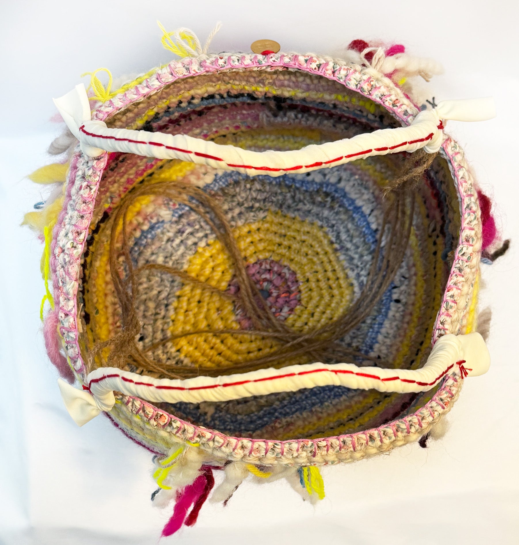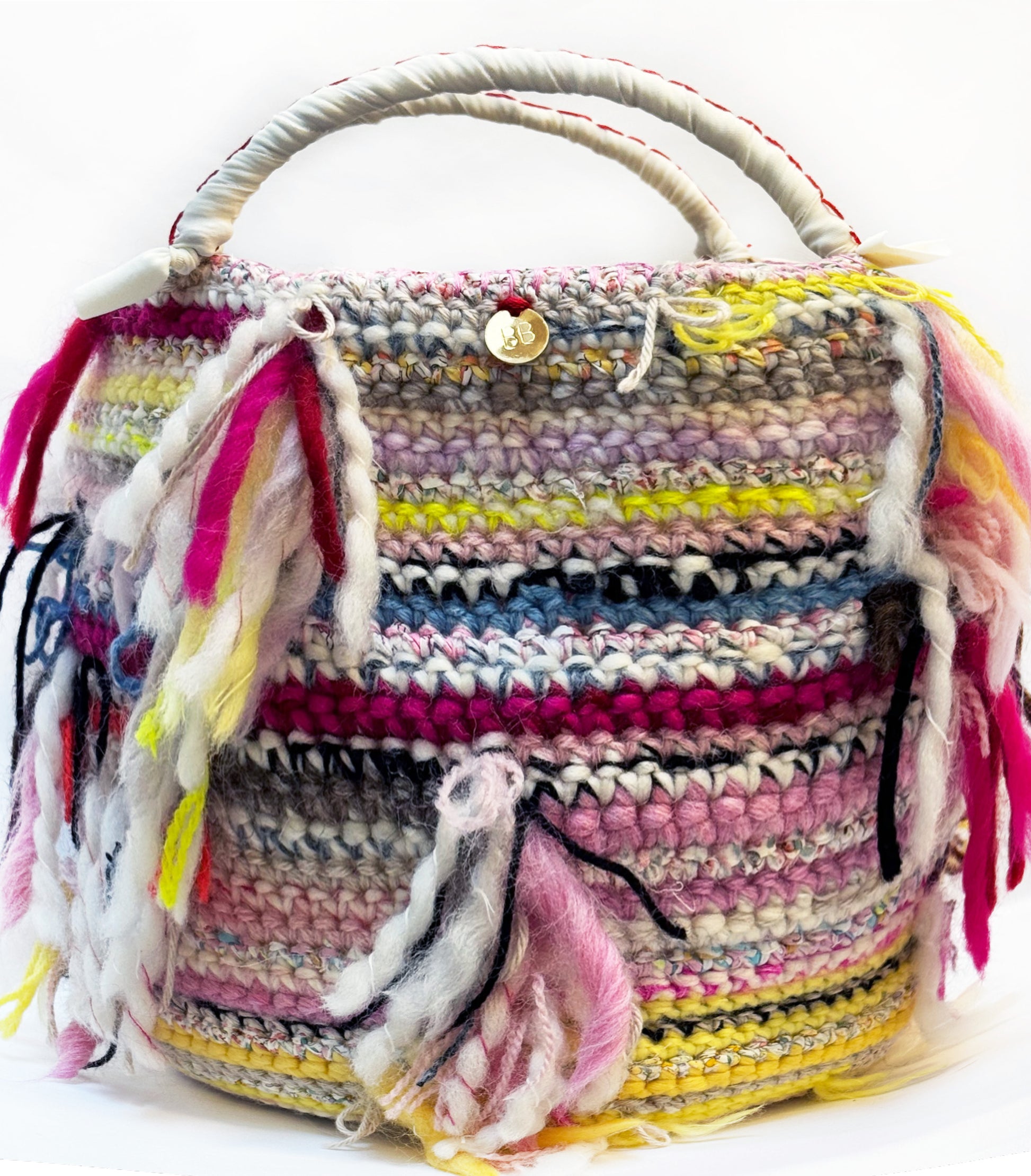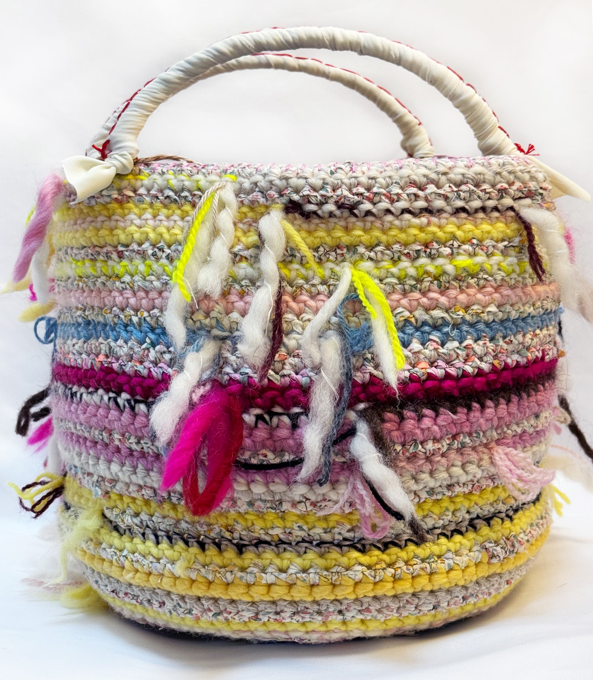 丸い底で自立する、バケツタイプのバッグ。ウールとコットンをミックスした素材ニラフィアのようなペーパーヤーンをミックスしたバスケット。シーズンレスに楽しめる逸品です。お財布にスマートフォン、ポーチなどはもちろん、折り畳み傘やペットボトルなど持って行きたいけれどちょっとかさばる...そんなエクストラも収納。マルチカラーにネオンピンクを添えてポップかつエッジを効かせました。さまざま色を重ねることで、どんな装いにもマッチするデザインです。