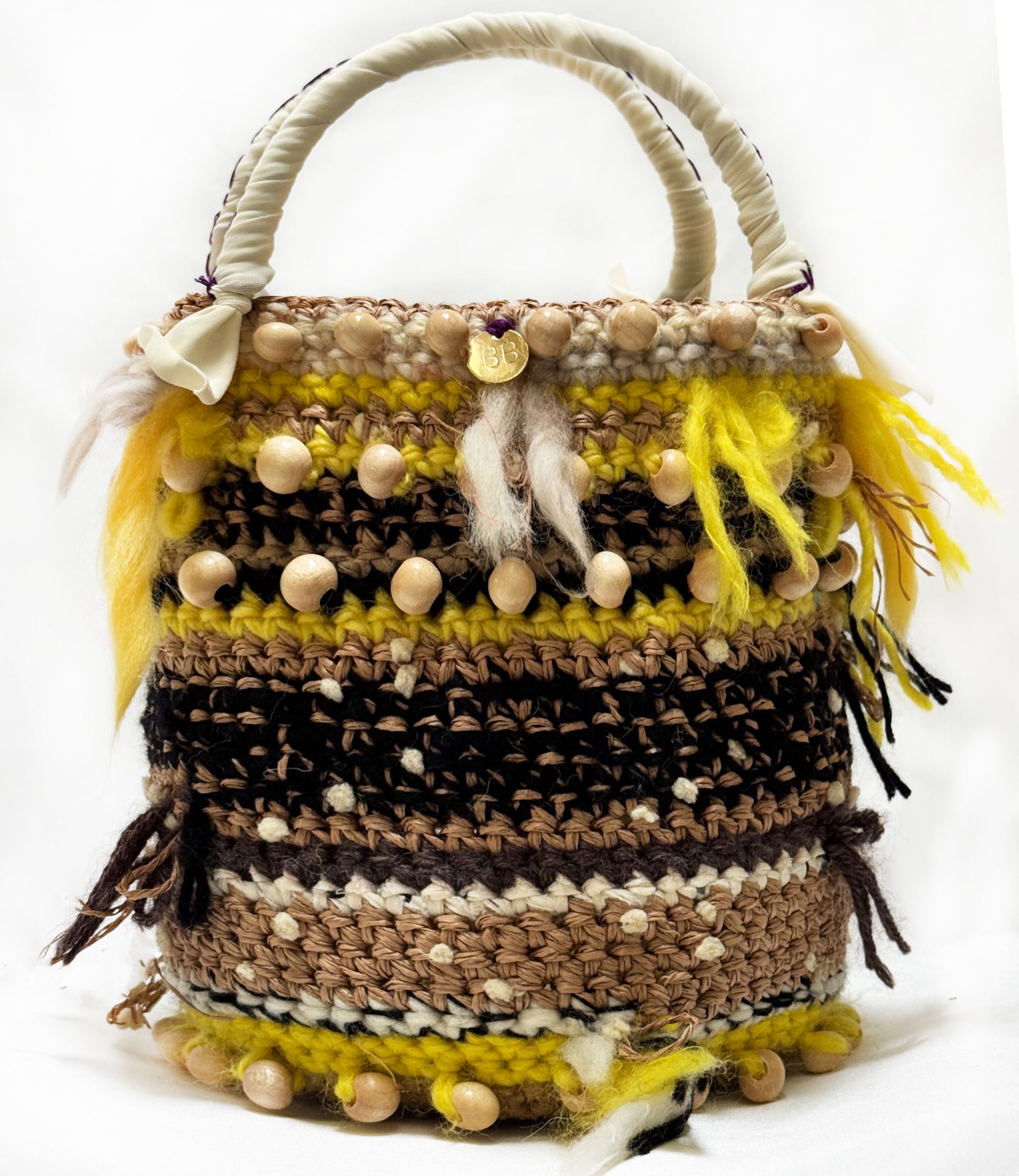 素材:本体:コットン、ウール、ペーパーラフィア、ウッドビーズ ハンドル:麻、ポリエステル、アセテート プレート:ステンレススティール